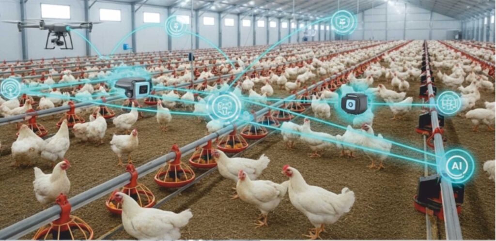 Like most sectors of the economy, the role of Artificial Intelligence (AI) and automation are having a profound impact. In the poultry industry in India, Artificial Intelligence (AI) and automation is gradually transforming and improving efficiency, productivity, and animal welfare. Artificial Intelligence (AI) powered systems are being used for real-time monitoring of poultry houses, optimizing feed formulations, improving disease detection and streamlining logistics and supply chain management. Currently there are challenges in poultry operations in commercial layers, broilers and breeding farms. The key challenges are adverse climatic conditions, shortage and availability of skilled workers, emerging viral and bacterial diseases. Due to the age of the poultry sheds, prevalence of the diseases not eradicated while cleaning. Shortage of quality feed ingredients, use of medicines and ensuring availability of quality drinking water are also impacting the poultry industry. The quality of chicken meat is being impacted while lack of marketing facilities as well as price information is also adversely impacting the poultry sector.