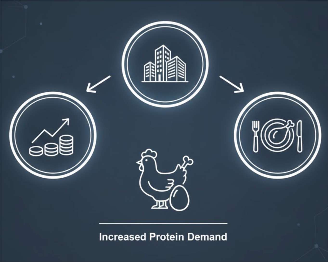 India’s poultry market is forecasted to grow at 8–10% CAGR through the 2020s, driven by rising protein consumption, especially among urban and middle-class populations. Preferences for quality, food safety, and traceability create incentives for smart traceable production systems.