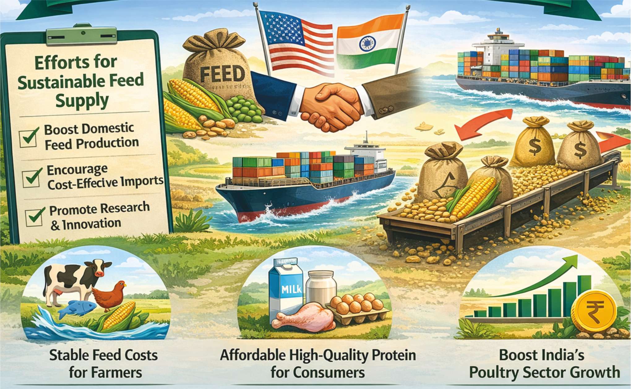 Ensuring sustainable feed supplies in coming years would be a key challenge for the sector. By ensuring cost-effective supply of animal feed ingredients, the government can directly address the challenge of feed inflation. This will not only stabilize production costs for poultry, dairy and aqua farmers but shall also ensure that high-quality protein remains affordable for the consumers. The interim deal with the US provides a window of opportunity for allowing feed ingredients imports which is expected to boost the sustainable growth of the India’s poultry sector in the coming years.